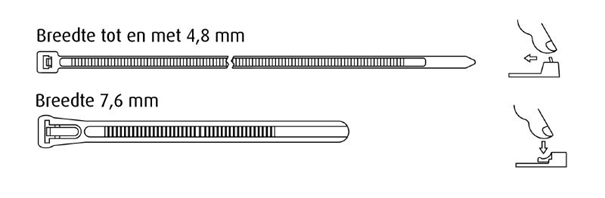 Wiederverwendbare Kabelbinder gibt es in zwei Arten von Verschlüssen. Die Art des Verschlusses der wiederverwendbaren Kabelbinder hängt von der Breite des Kabelbinders ab. Wiederverwendbare Kabelbinder mit einer Breite von 3,6 mm oder 4,8 mm haben einen Verschluss, bei dem der Kabelbinder mit einem Hebel oben am Verschluss gelöst werden kann. Wiederverwendbare Kabelbinder mit einer Breite von 7,6 mm, können mit einem Verriegelungsmechanismus unter dem Kopf des Kabelbinders gelöst werden; siehe die folgende Abbildung für beide Schließmechanismen.